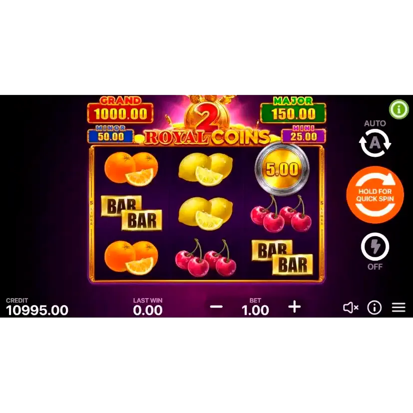 Royal Coins 2: Hold and Win klassik meyvə slotu üslubunda hazırlanmış, “Hold and Win” bonus mexanikası ilə seçilən məşhur onlayn slot oyunudur. Oyunun sadə qaydaları və sikkə toplama xüsusiyyəti həm yeni başlayanlar, həm də təcrübəli oyunçular üçün əlçatan edir. Rəngarəng dizaynı və tez-tez aktivləşən bonus raundları onu bir çox kazino platformasında populyar edib.